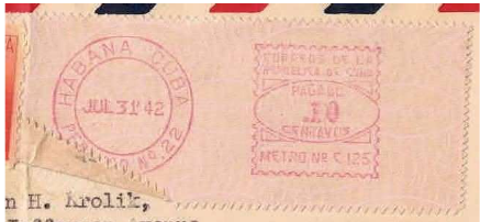 A3. Pitney Bowes “R”, 1946. A horizontal design with simulated perforation borders enclosing the date stamp, origin locality, permit, postage, and the machine number, “METRO Nº”, with the prefix “C” at the bottom (Figure 4). Inscribed at the top: “CORREOS DE LA / REPÚBLICA DE CUBA / PAGADO / CENTAVOS”.